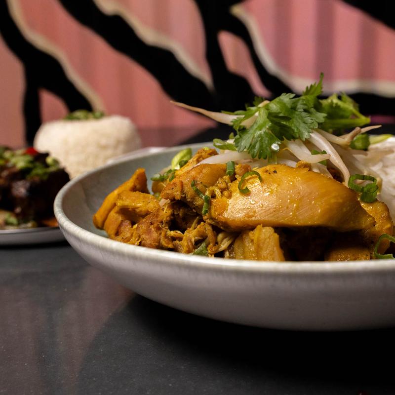 Chicken marinated in lemongrass, garlic, shallots, cucumber, pickled vegetables, side of jasmine rice.