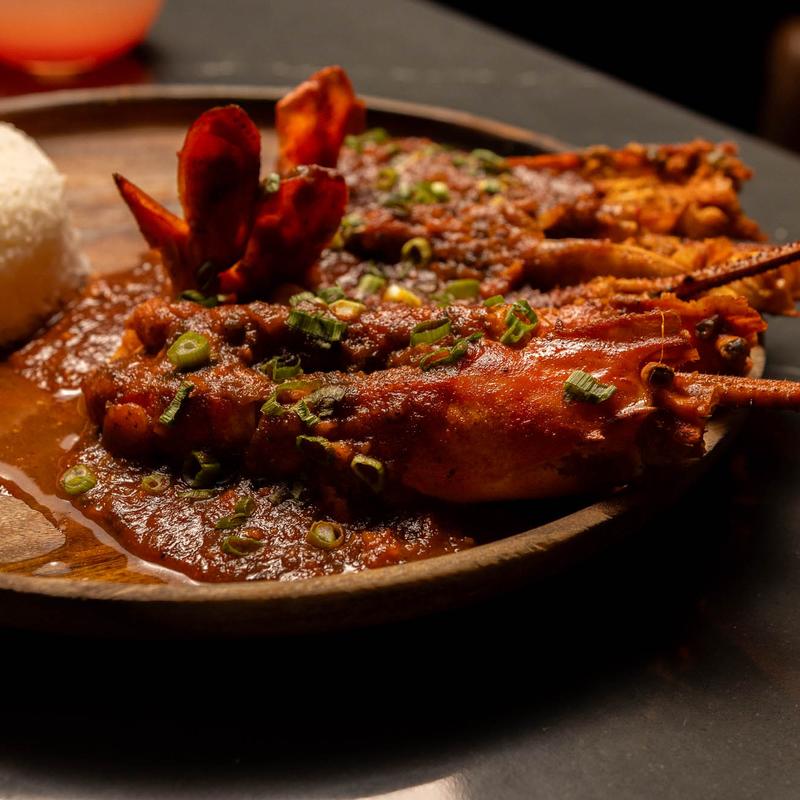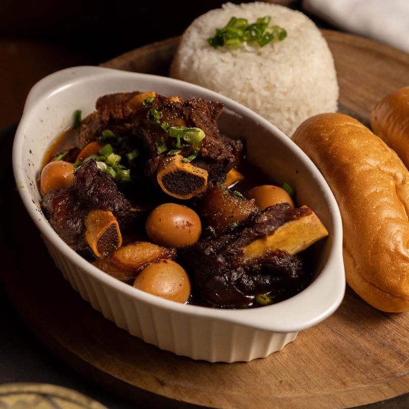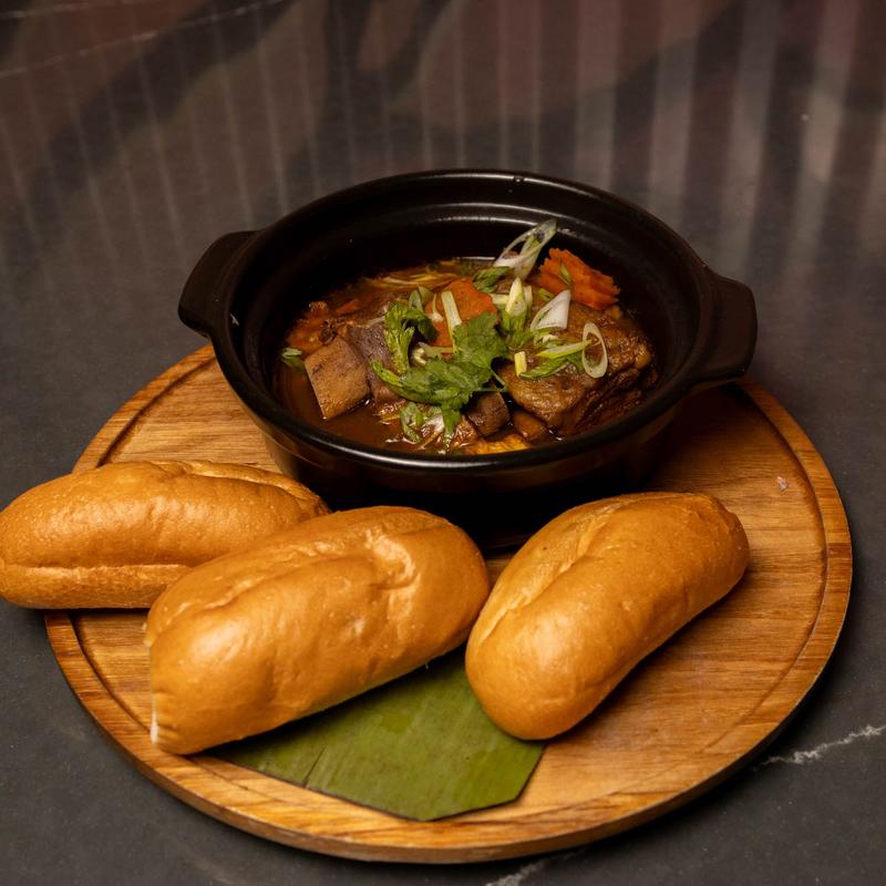 Caramelized pork belly and pork shoulder, side of jasmine rice, and mini baguettes.