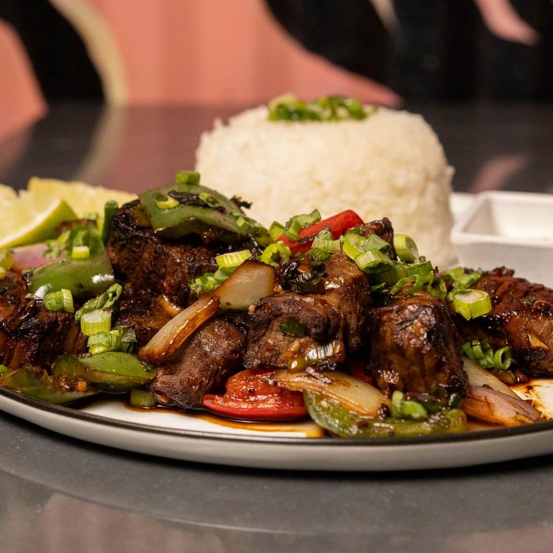 8oz prime filet mignon, soy sauce, red, yellow, and green peppers, side of jasmine rice.