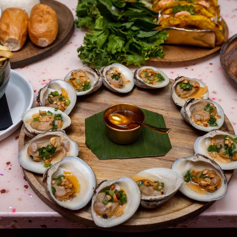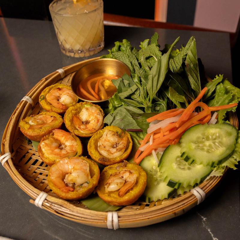 Savory mini pancakes, shrimp, pork, lettuce, mint, basil.